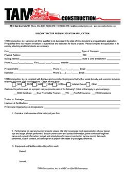 TAM Construction, Inc. is building a bench of subcontractors prequalified to work with us on state and federal projects. DBEs such MBE, EDGE, WBE, and members of any other organization furthering economic and social diversity and inclusion are strongly encouraged to apply. Complete the fillable subcontractor prequalification application and return via mail, email, or fax.
